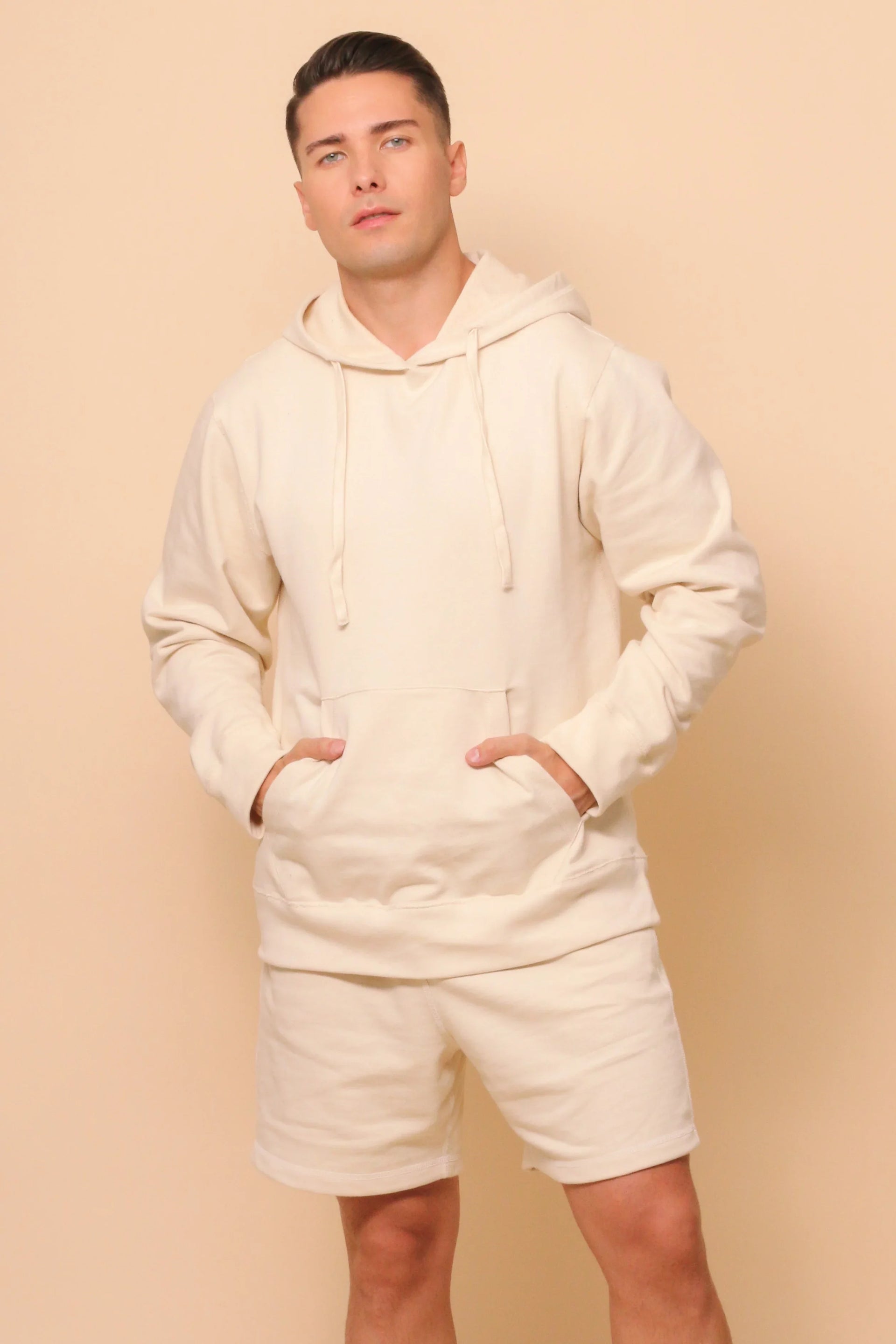 Organic cotton French terry hoodie with a kangaroo pocket and elastic-free cuffs for gentle wear.