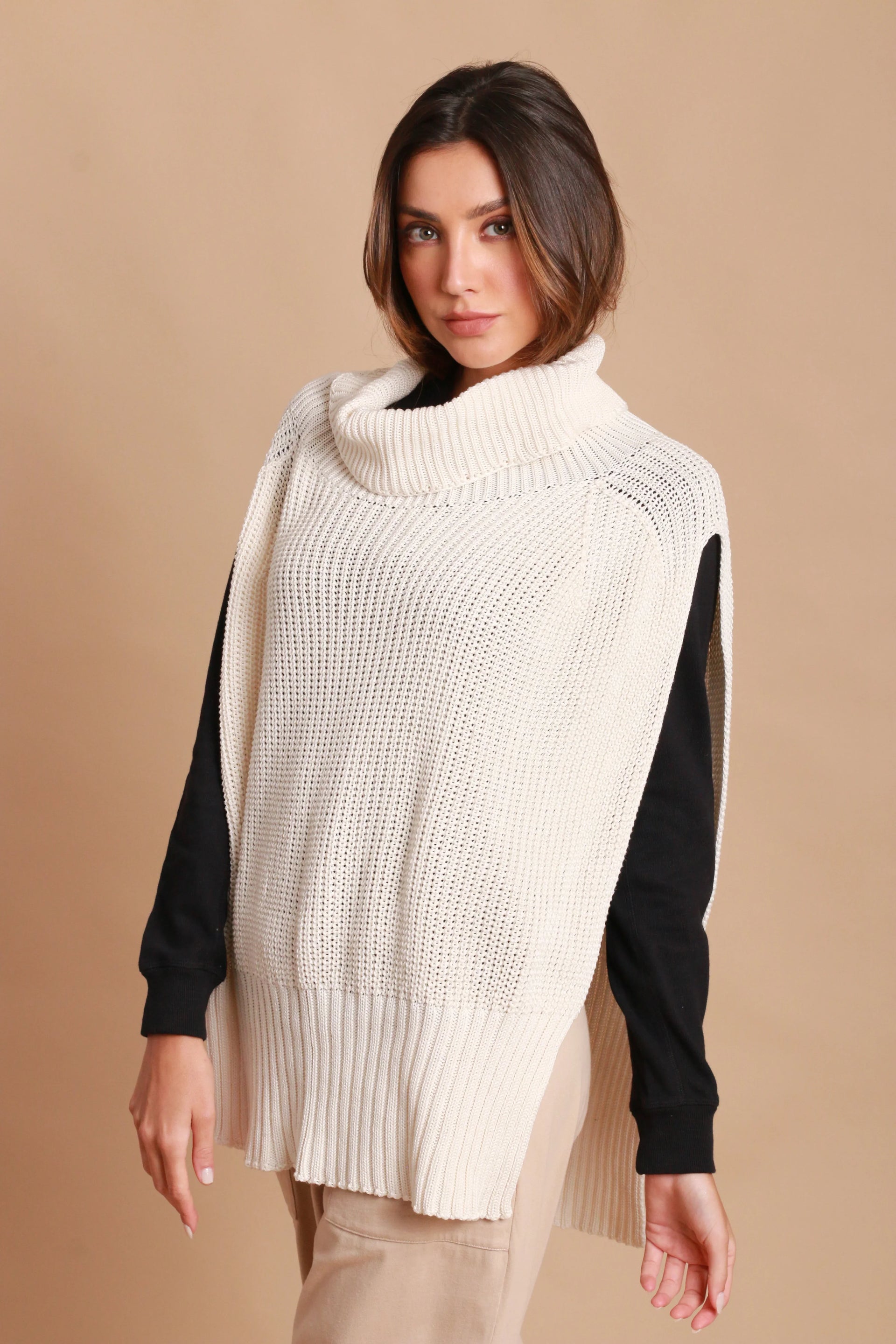 Organic cotton turtleneck overlay for breathable warmth and sensitive-skin comfort.